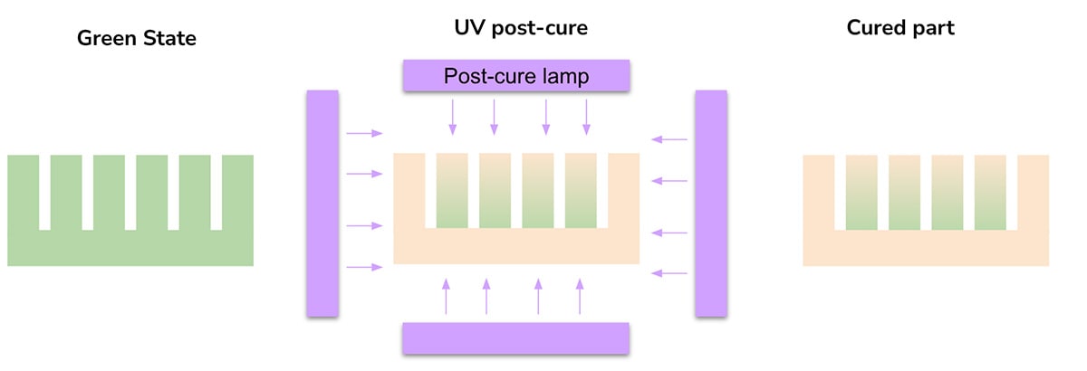 Most of these “single-cure” materials have two steps to their curing process: a UV-cure during the printing process and a UV post-cure, which is typically done in a curing chamber with a high-power UV source. In a typical case, the material undergoes partial polymerization in the printer and further conversion in the UV post-cure. The addition of heat during the UV post-cure, or heat generated from the post-cure itself, is often important to obtain high conversion and the best possible properties. Because the UV post-cure drives final properties, the “line-of-sight” of the light source is important. Internal sections or geometries that lead to “shadowing” are unlikely to reach full conversion and therefore may be weaker than the rest of the part. Non-uniform curing throughout a part is a significant limitation of this approach (Figure 1).