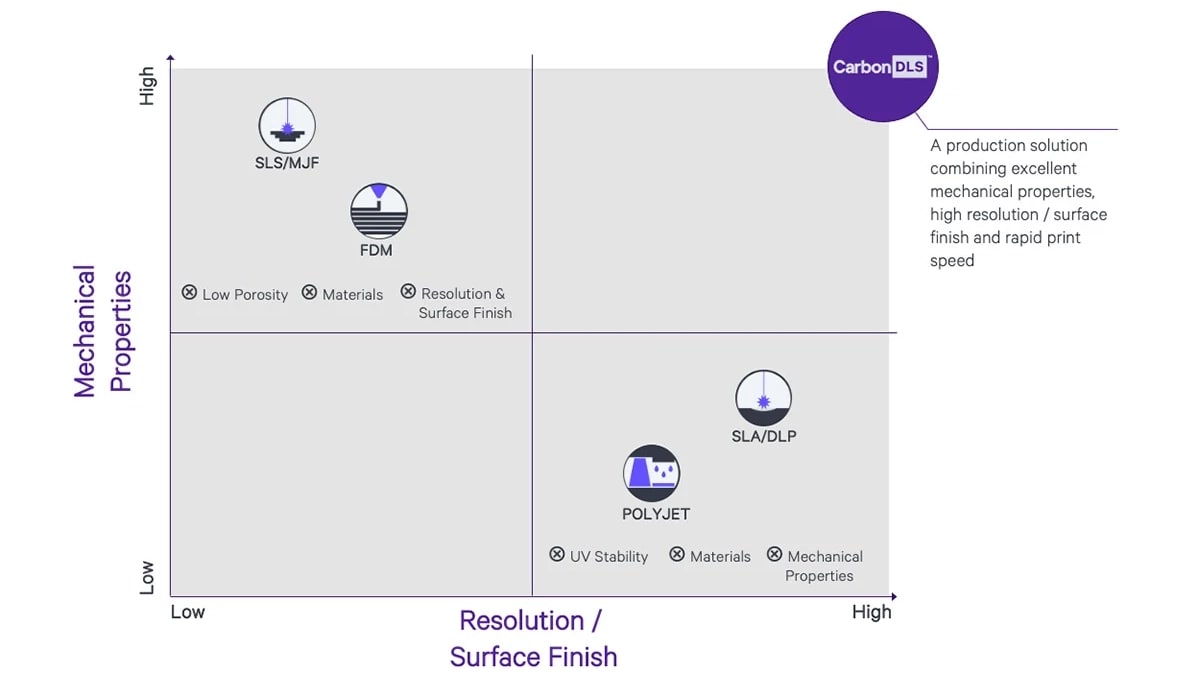 Both thermosets and thermoplastics are widely used in 3D printing processes. The resulting properties are a combination of both the intrinsic material properties and the processes used during printing and post-processing. Most 3D printing methods rely on a layer-by-layer process that results in poor entanglement or bonding of polymer chains at the interface between layers. This results in point defects at each layer and anisotropic mechanical properties. In contrast, Carbon Digital Light Synthesis (DLS) projects light through an oxygen-permeable window into a reservoir of UV-curable resin. As a sequence of UV images is projected, the part solidifies and the build platform rises. Just above the window, a dead zone prevents resin from adhering, which maintains a space for liquid resin to flow into the build area. This process creates a gradient of polymerization within each layer that significantly improves layer-to-layer adhesion, resulting in parts with isotropic material properties. Additionally, the reduction in adhesion forces allows for significantly faster printing.