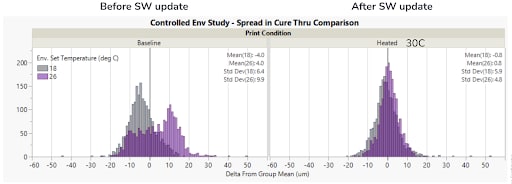 The photopolymerization process is sensitive to temperature during cure. In general, greater cure occurs at a higher temperature compared to a lower temperature. Depending on the room temperature in a production facility, cure can be affected, albeit at a minor level. However, these minor changes contribute to the stack-up of dimensional variation that can affect, for example, the dental model and die fit or the terminal size on an electrical connector. The M3, M3 Max, and L1 printers have direct infrared heating capabilities, and heating to a mild level of 30℃ was implemented via software update. This significantly tightened the distributions of part sizes on a test part with many small features.
