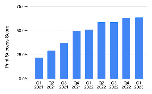 To address these challenges, Carbon adopted multiple strategies to improve the likelihood that a part is printed successfully. These include hardware and materials improvements, but the most significant has been Carbon’s over-the-air software upgrades included with the printer subscription. Since the launch of the M1 printer in 2016, Carbon has released 45 software upgrades to its fleet of printers and part washers. The likelihood of getting an acceptable part has increased dramatically over this period. We refer to this likelihood as “Print Success,” and it includes the combined success of prepping the print, the print process itself, and post-processing. An error at any of these steps can render the part unacceptable.