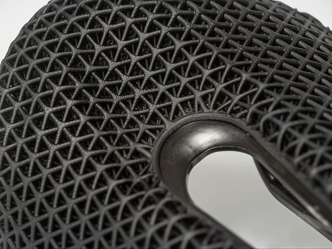Prototek suggested Carbon’s EPU 41, which is a durable, highly elastomeric, energy-returning material that offers cushioning and gripping for the rider. It also lends itself to multi-zonal lattice designs that are extremely breathable and can be tuned precisely to offer a variety of mechanical responses to give riders a better ride overall.