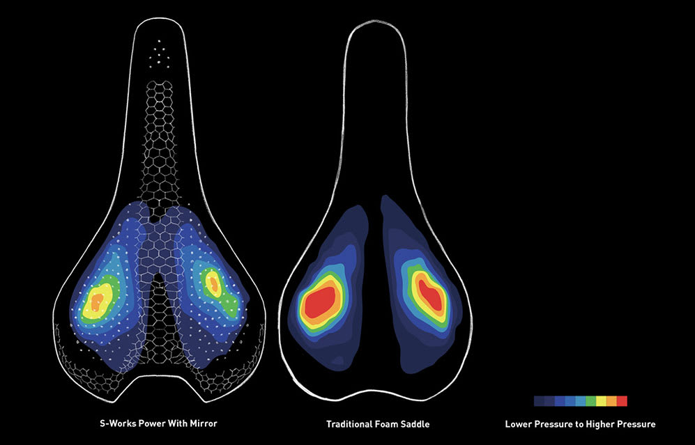 The S-Works Romin Evo with Mirror has been specially developed for the performance cycling market. These applications must meet the highest level in rider perceived comfort, pelvic stability, and soft tissue health. Poor seat comfort can lead to injuries and abrasions and thus directly affects the performance of the cyclist.