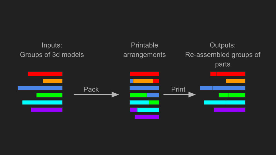 When we reject a part that doesn’t fit, we’re rejecting it based on its shape and not what group it belongs to. What’s wrong with this? Well, now we’re breaking up the groups more than we need to. In the gif above, a red part is rejected in the first pack leading to a print with 3 different groups. This entropy then cascades over 8 hours of printing and we can easily end up with 4+ different groups on the same print. That slows our customers down because they have a bunch of mouths to sort off of a single print. We can do better.