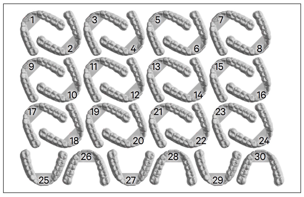Customers send us groups of models which can vary wildly in size. We need to make efficient prints, which means that we want to use all the available surface on the printers. We can usually fit close to 30 parts on a print which means we need a system that can take different sized groups of parts and make similarly sized printable arrangements. After they print, customers put aligners back into their original group.